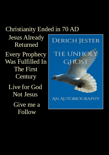 My name is Derich Jester. God gave me the truth about the Bible that has never been known for nearly two thousand years. God told me Christianity Ended in AD 70 when the temple in Jerusalem was destroyed and all biblical prophecy was fulfilled. I dedicate my life to setting people free and teaching them how to live for God today, in our day, and not in the past. My books, YouTube, and TikTok links are all to the left of the screen, just click the icons for Amazon, YouTube or TikTok. I have over a thousand videos explaining the Bible, history, and how to live for God today. Also to the left of this page, it will show you links to recent posts, and blogs that I am writing, explaining all the questions people have about the Bible. I will be writing blogs on many subjects, including the 1000 year reign of Christ, the mark of the beast, the beast, Mystery Babylon, the Timeline of Revelation, and much more.. Check back often for new content.